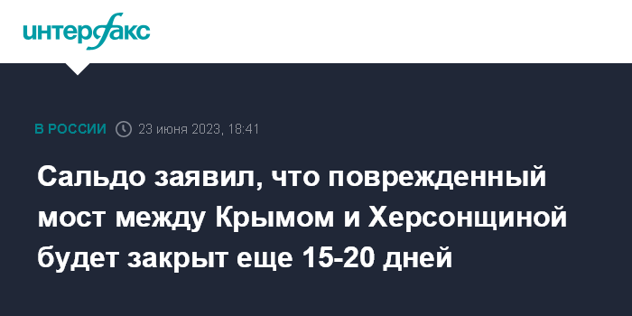 Москва. 23 июня. INTERFAX.RU - Поврежденный украинским обстрелом мост на административной границе между Крымом и Херсонской областью вблизи Чонгара будет закрыт для движения дольше, чем ожидалось, сообщил врио губернатора Херсонской области Владимир Сальдо.