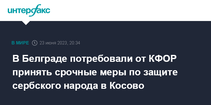 Москва. 23 июня. INTERFAX.RU - Власти Сербии вновь пригрозили Косово военной интервенцией в случае, если Силы НАТО для Косово (КФОР) не смогут защитить этнических сербов от действий местных властей, сообщает в пятницу Associated Press.