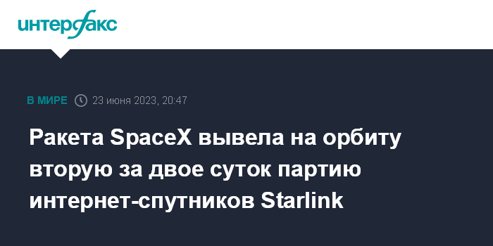 Москва. 23 июня. INTERFAX.RU - Ракета-носитель Falcon 9 в пятницу успешно вывела на орбиту очередную партию из 56 мини-спутников для пополнения орбитальной группировки глобальной сети интернет-покрытия системы Starlink, сообщила компания-разработчик SpaceX.