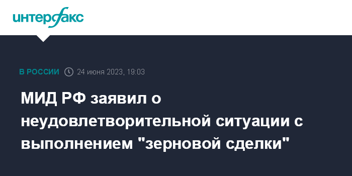 Москва. 24 июня. INTERFAX.RU - МИД РФ выразил неудовлетворение ситуацией вокруг выполнения стамбульских договоренностей в сфере экспорта российской сельхозпродукции.