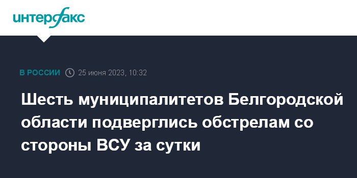 Москва. 25 июня. INTERFAX.RU - Губернатор Белгородской области Вячеслав Гладков сообщил о нанесенных ударах с украинской стороны по территории региона за минувшие сутки.