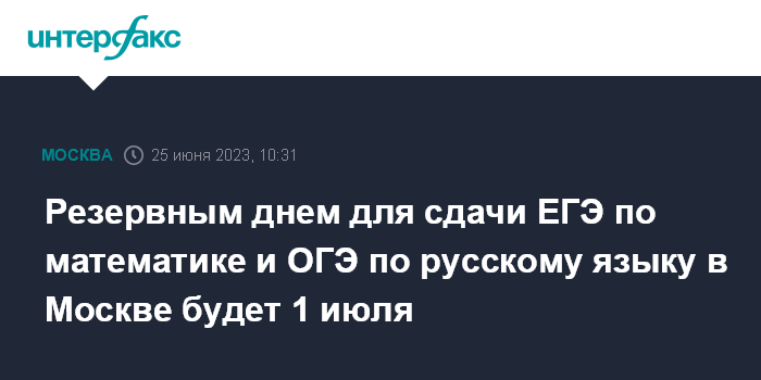 Москва. 25 июня. INTERFAX.RU - Резервный день сдачи Единого государственного экзамена по математике и основного госэкзамена по русскому языку из-за объявления 26 июня выходным днем переносится на 1 июля, сообщили журналистам в пресс-службе комплекса социального развития Москвы.