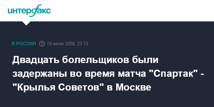 Москва. 19 июля. ИНТЕРФАКС - Двадцать человек были задержаны во время матча Чемпионата России по футболу между командами Спартак и Крылья Советов, который состоялся в воскресенье на стадионе Лужники в Москве, сообщили "Интерфаксу" в управлении информацией и общественных связей ГУВД Москвы.