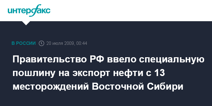 Москва. 20 июля. ИНТЕРФАКС - Премьер-министр РФ Владимир Путин подписал постановление о введении специальной экспортной пошлины на нефть, добываемую на 13 месторождениях Восточной Сибири.