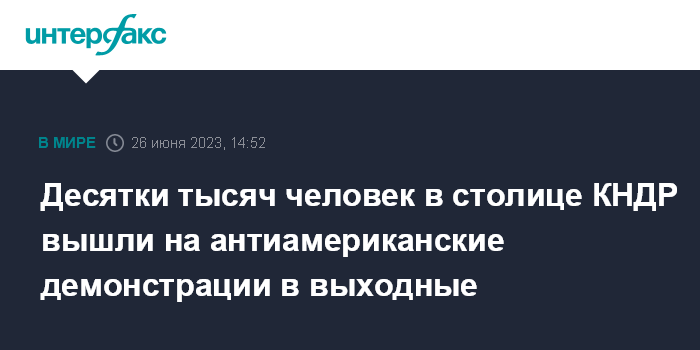 Москва. 26 июня. INTERFAX.RU - Несколько десятков тысяч человек в выходные приняли участие в крупных антиамериканских демонстрациях в северокорейской столице Пхеньяне, сообщают официальные СМИ КНДР.