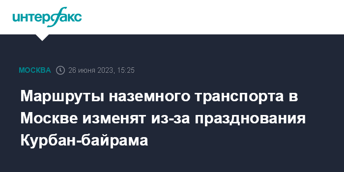 Москва. 26 июня. INTERFAX.RU - Некоторые маршруты общественного транспорта Москвы будут изменены из-за празднования Курбан-байрама, сообщили в столичном дептрансе.