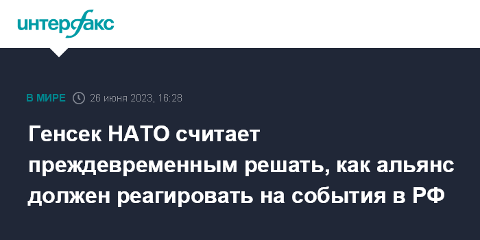Москва. 26 июня. INTERFAX.RU - Генеральный секретарь НАТО Йенс Столтенберг заявил, что альянсу еще рано решать, как реагировать на события минувших выходных в России.