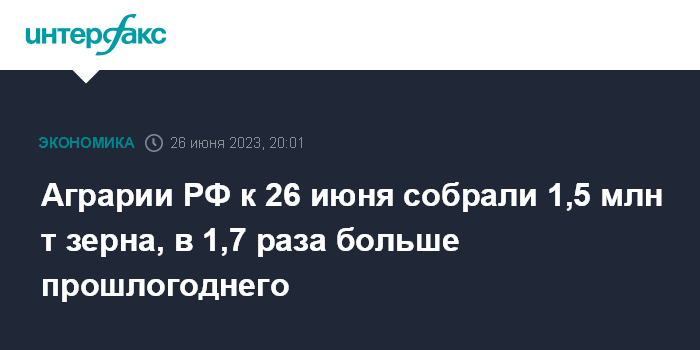 Аграрии РФ к 26 июня собрали 1,5 млн т зерна, в 1,7 раза больше прошлогоднего
