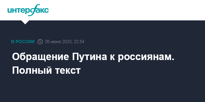Москва. 26 июня. INTERFAX.RU - Президент России Владимир Путин в понедельник вечером выступил с обращением к гражданам страны. Полный текст обращения опубликован на сайте Кремля.