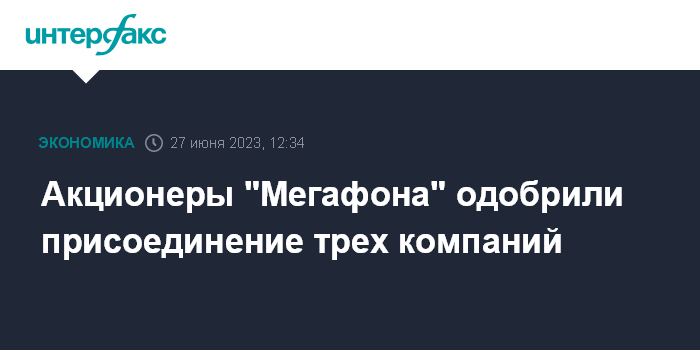Москва. 27 июня. INTERFAX.RU - Акционеры ПАО "Мегафон" на внеочередном собрании одобрили реорганизацию путем присоединения трех компаний - ООО "Мегафон Финанс", системного интегратора ООО "Талмер" и разработчика мобильных платежных инструментов ООО "ИнПлат", говорится в сообщении оператора.
