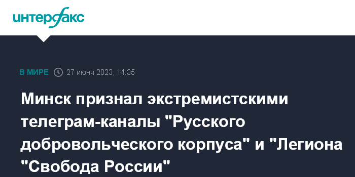 Москва. 27 июня. INTERFAX.RU - В Белоруссии признаны экстремистскими телеграм-каналы "Русского добровольческого корпуса" и "Легиона "Свобода России" (вооруженное формирование, признано в РФ террористическим и запрещено), сообщила пресс-служба Генеральной прокуратуры республики.