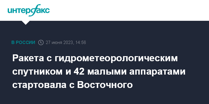 Москва. 27 июня. INTERFAX.RU - Ракета-носитель "Союз-2.1б" с разгонным блоком "Фрегат", которая должна вывести на орбиту гидрометеорологический спутник "Метеор-М" №2-3 и 42 малых космических аппарата (МКА), стартовала во вторник с космодрома Восточный, следует из трансляции "Роскосмоса".