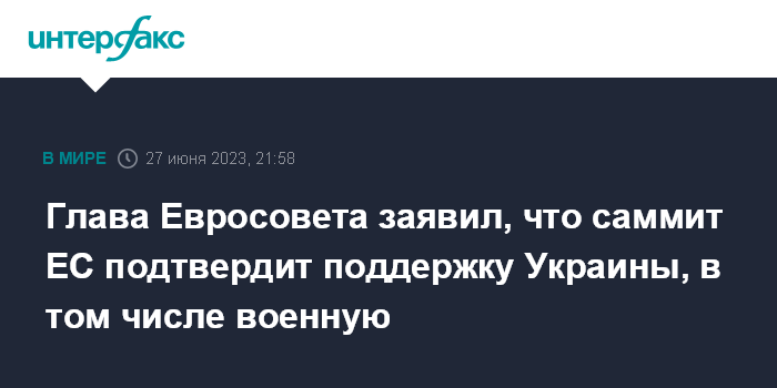 Москва. 27 июня. INTERFAX.RU - Лидеры Евросоюза на саммите ЕС 29-30 июня подтвердят свою приверженность поддержке Украины, сколько потребуется, в том числе через финансовую и военную помощь, заявил глава Евросовета Шарль Мишель.