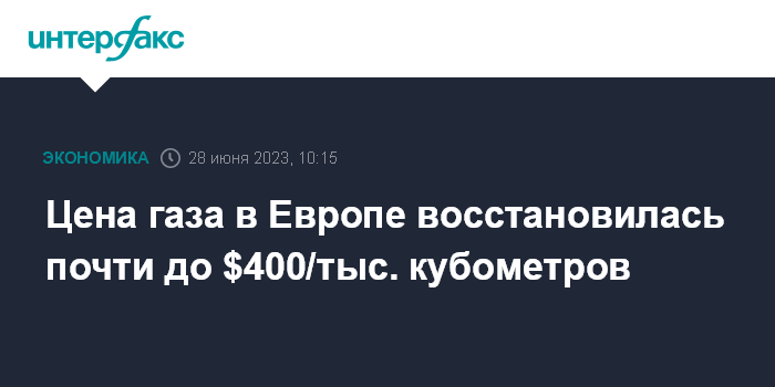 Москва. 28 июня. INTERFAX.RU - Спотовая цена газа в Европе преодолела традиционный еженедельный спад на фоне наступления выходных и снова находится в районе $400 за тысячу кубометров.