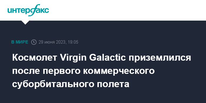 Москва. 29 июня. INTERFAX.RU - Пилотируемый космолет SpaceShipTwo (VSS Unity) в четверг совершил успешную посадку после совершения первого коммерческого суборбитального полета, сообщила компания-разработчик Virgin Galactic.