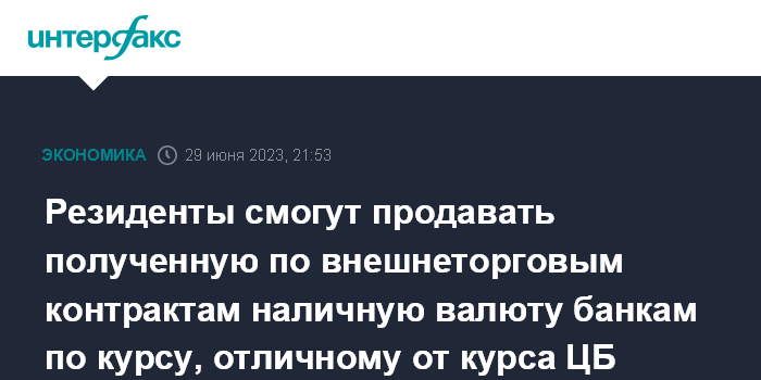 Москва. 29 июня. INTERFAX.RU - Правительство РФ отказалось от требования, чтобы продажа резидентами уполномоченным банкам полученной от нерезидентов по внешнеторговым контрактам наличной валюты осуществлялась по курсу ЦБ РФ. Теперь они смогут использовать для этого валютные курсы, отличные от официального.