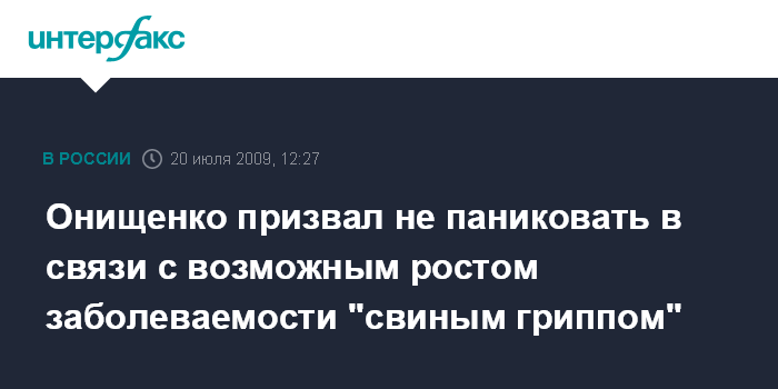 Москва. 20 июля. INTERFAX.RU - Главный государственный санитарный врач России Геннадий Онищенко призвал россиян не поддаваться панике из-за ожидаемого роста заболеваемости гриппом H1/N1 предстоящей осенью.