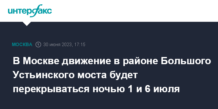 В Москве движение в районе Большого Устьинского моста будет перекрываться ночью 1 и 6 июля
