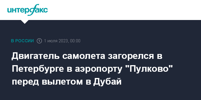 Москва. 30 июня. INTERFAX.RU - Двигатель пассажирского самолета Санкт-Петербург-Дубай загорелся перед вылетом в "Пулково", сообщили "Интерфаксу" в экстренных службах.