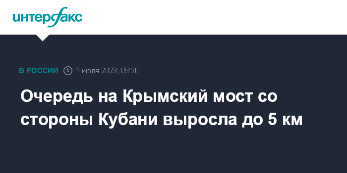 Москва. 1 июля. INTERFAX.RU - Пятикилометровая очередь образовалась в субботу перед Крымским мостом со стороны Краснодарского края, сообщил министр транспорта Крыма Николай Лукашенко.