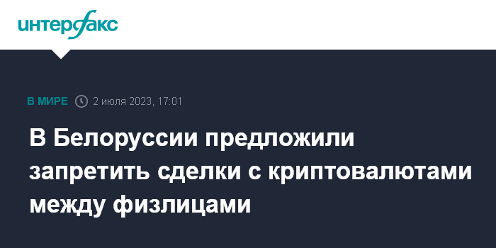 Москва. 2 июля. INTERFAX.RU - МВД Белоруссии выступило с предложением запретить сделки по обмену криптовалюты между физлицами.