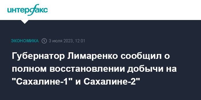 Москва. 3 июля. INTERFAX.RU - Добыча углеводородов в рамках проектов "Сахалин-1" и "Сахалин-2" полностью восстановилась, сообщил журналистам губернатор Сахалинской области Валерий Лимаренко.