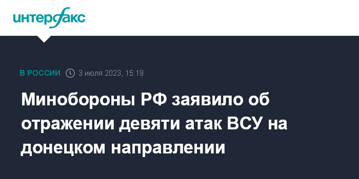 Москва. 3 июля. INTERFAX.RU - Девять атак украинских войск отразили на донецком направлении подразделения "Южной" группировки, сообщил официальный представитель министерства обороны РФ Игорь Конашенков на брифинге в понедельник.