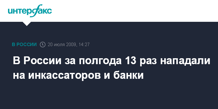 Тула. 20 июля. INTERFAX.RU - В России за полгода совершено 13 нападений на инкассаторов и банковские учреждения, находящиеся под охраной частных охранных предприятий (ЧОП), сообщил первый заместитель министра внутренних дел Михаил Суходольский в понедельник на выездном совещании в Туле.