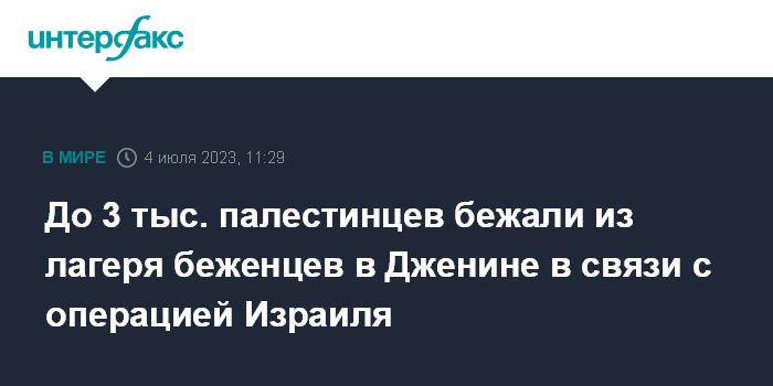 Москва. 4 июля. INTERFAX.RU - Примерно 3 тыс. палестинцев были вынуждены покинуть лагерь беженцев в Дженине на Западном берегу реки Иордан в связи с операцией армии обороны Израиля. Об этом сообщает во вторник Haaretz со ссылкой на заместителя губернатора Дженина Камаля Абу аль-Руба.