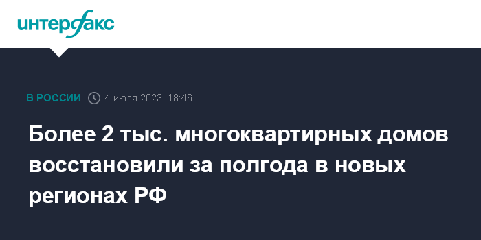 Москва. 4 июля. INTERFAX.RU - Более 2 тыс. многоквартирных домов (МКД) восстановили в ЛНР, ДНР, Херсонской и Запорожской областях за первое полугодие 2023 года, сообщил во вторник вице-премьер РФ Марат Хуснуллин.