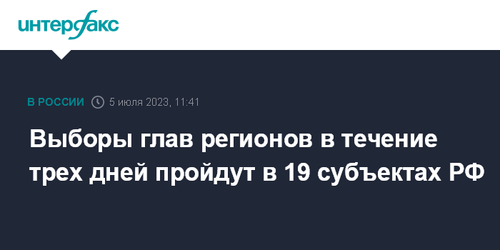 Москва. 5 июля. INTERFAX.RU - Выборы глав субъектов России, которые состоятся в сентябре текущего года в 21 регионе, пройдут в течение трех дней в 19 субъектах страны, сообщила глава Центризбиркома России Элла Памфилова.