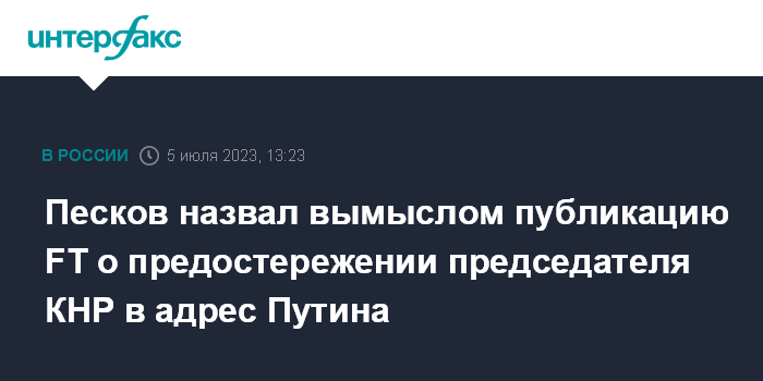 Песков назвал вымыслом публикацию FT о предостережении председателя КНР в адрес Путина