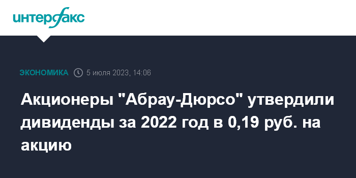 Москва. 5 июля. INTERFAX.RU - Акционеры компании "Абрау-Дюрсо", ведущего производителя игристых вин в РФ, на годовом собрании утвердили дивиденды за 2022 год и за первый квартал 2023 года.