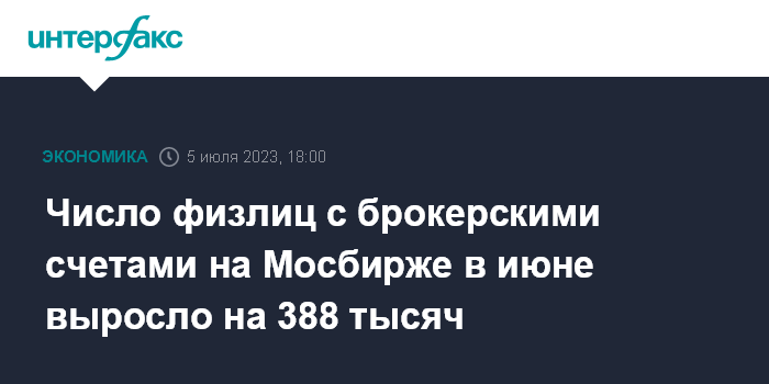 Москва. 5 июля. INTERFAX.RU - Количество физлиц, имеющих брокерские счета на Московской бирже, в июне 2023 года увеличилось на 388 тысяч, до 25,95 млн человек, сообщается в пресс-релизе биржи.