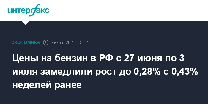 Цены на бензин в РФ с 27 июня по 3 июля замедлили рост до 0,28% с 0,43% неделей ранее