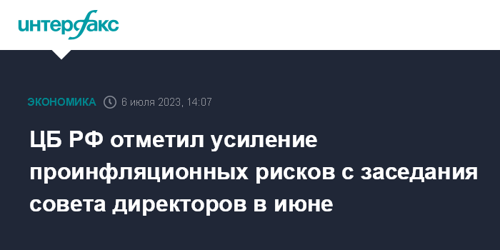 Москва. 6 июля. INTERFAX.RU - ЦБ РФ отмечает усиление проинфляционных рисков за месяц.