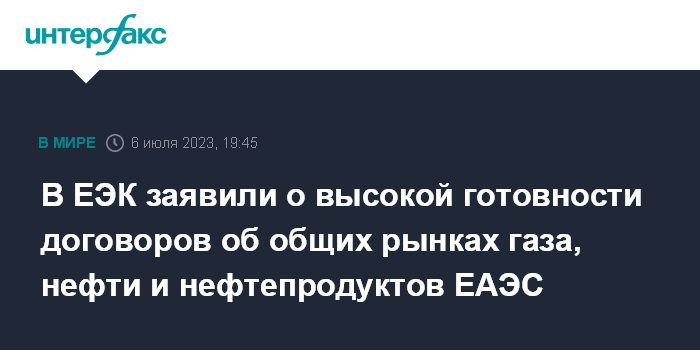 "Это позволило бы обеспечить практическую реализуемость принимаемых документов и готовность к запуску общих рынков. Запуск общих рынков позволит сделать значительный шаг вперед по сравнению с текущей ситуацией, проводить более гибкую экономическую политику на общем рынке и на двусторонней, и на многосторонней основе, даст возможность хозяйствующим субъектам работать самостоятельно, заключая как свободные договоры, так и биржевые сделки на недискриминационных условиях", - отметил представитель ЕЭК.