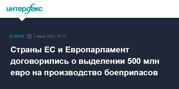Москва. 7 июля. INTERFAX.RU - Страны Евросоюза и Европарламент достигли соглашения о срочном выделении 500 млн евро для увеличения производства боеприпасов с целью укрепить оборону ЕС и помочь Украине, сообщает в пятницу Associated Press (AP).