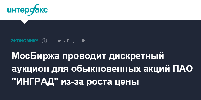 МосБиржа проводит дискретный аукцион для обыкновенных акций ПАО "ИНГРАД" из-за роста цены