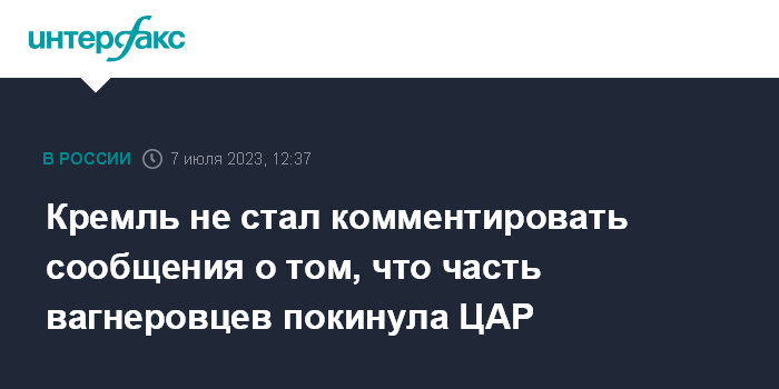 Москва. 7 июля. INTERFAX.RU - В Кремле оставили без комментариев сообщения СМИ о том, что несколько сотен бойцов группы "Вагнер" покинули Центральноафриканскую республику (ЦАР).