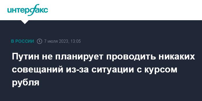 Москва. 7 июля. INTERFAX.RU - Президент РФ Владимир Путин не планирует проводить никаких совещаний, касающихся текущего курса рубля, заявил пресс-секретарь главы российского государства Дмитрий Песков.