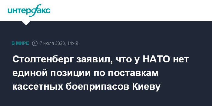 Москва. 7 июля. INTERFAX.RU - У НАТО нет общей позиции по поставкам Украине кассетных боеприпасов, каждая страна-союзник по альянсу сама принимает решение по этому вопросу, заявил в пятницу генсек НАТО Йенс Столтенберг.