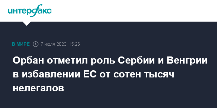 Москва. 7 июля. INTERFAX.RU - Действия, предпринятые вовремя Сербией и Венгрией, помогли не допустить в Европу значительно большее число нелегалов, чем в итоге пришлось принять европейским странам, заявил в эфире сербского телеканала РТС венгерский премьер-министр Виктор Орбан.