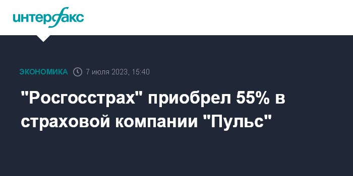 Москва. 7 июля. INTERFAX.RU - ПАО СК "Росгосстрах" приобрело долю в 55% в ООО СК "Пульс", следует из данных ЕГРЮЛ.