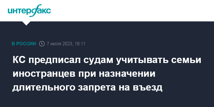Москва. 7 июля. INTERFAX.RU - Нарушение миграционных сроков пребывания в отсутствие других оснований для запрета на въезд в Россию не может иметь превалирующего значения для суда без учета возможных негативных последствий для российской семьи иностранца, к такому выводу пришел Конституционный суд РФ.