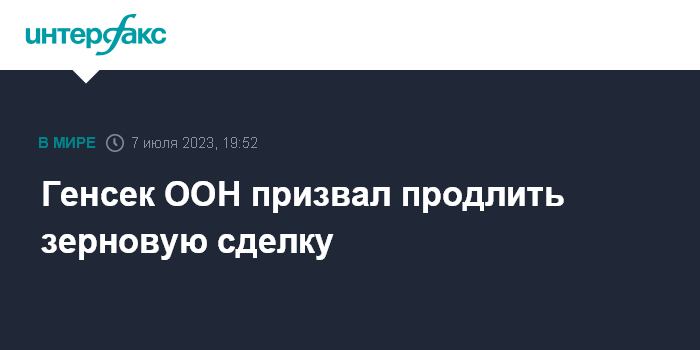 Москва. 7 июля. INTERFAX.RU - Генсек ООН Антониу Гутерриш призвал продлить черноморскую зерновую инициативу, действие которой, по его словам, помогает снижать рост цен на продовольствие в мире.