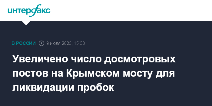 Москва. 9 июля. INTERFAX.RU - Количество досмотровых постов на въездах на Крымский мост увеличено для устранения пробок, которые днем в воскресенье выросли до нескольких километров, сообщил министр транспорта Крыма Николай Лукашенко.