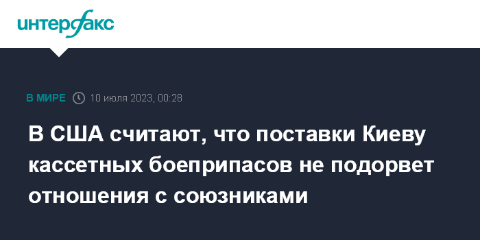 Москва. 10 июля. INTERFAX.RU - Решение президента США Джо Байдена отправить Украине кассетные боеприпасы не вызовет ухудшения отношений с союзниками по НАТО, заявил в воскресенье советник американского президента по нацбезопасности Джейк Салливан.