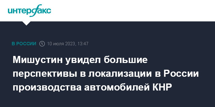Москва. 10 июля. INTERFAX.RU - Локализация производства автокомпонентов и автомобилей китайских компаний имеет большие перспективы для российского рынка, заявил на "Иннопроме-2023" премьер-министр Михаил Мишустин.