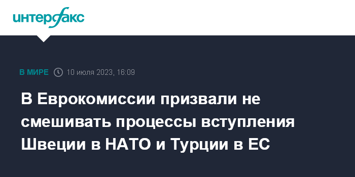 Москва. 10 июля. INTERFAX.RU - Процессы вступления Швеции в НАТО, а Турции - в ЕС развиваются параллельно, но их не следует смешивать, заявила официальный представитель Еврокомиссии (ЕК) Дана Спинант.